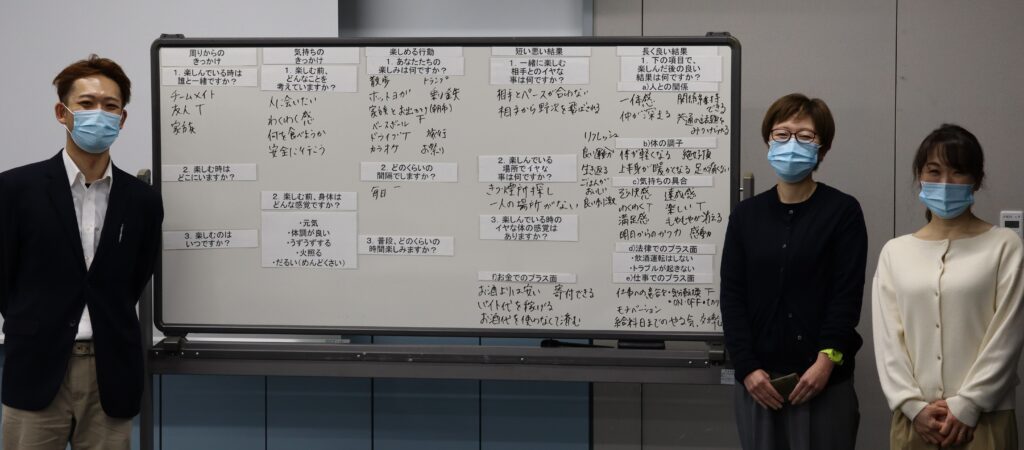 研修会では、まずアルコールの基礎知識を学び、 その後、お酒以外で2人以上で楽しめることについて、参加者個々で考え、書き出し、全員が発表しました。