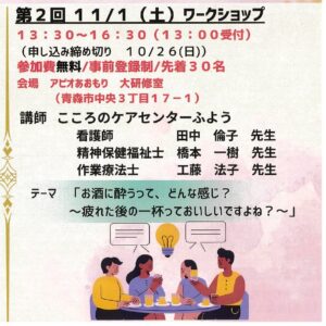 11月1日、アピオ青森大会議室において、 青森大学主催「お酒に酔うってどんな感じ?疲れた後の一杯っておいしいですよね?」 というお酒との付き合い方を考える研修会が開催されました。 当院の田中看護師、橋本精神保健福祉士、工藤作業療法士が講師を務めました。