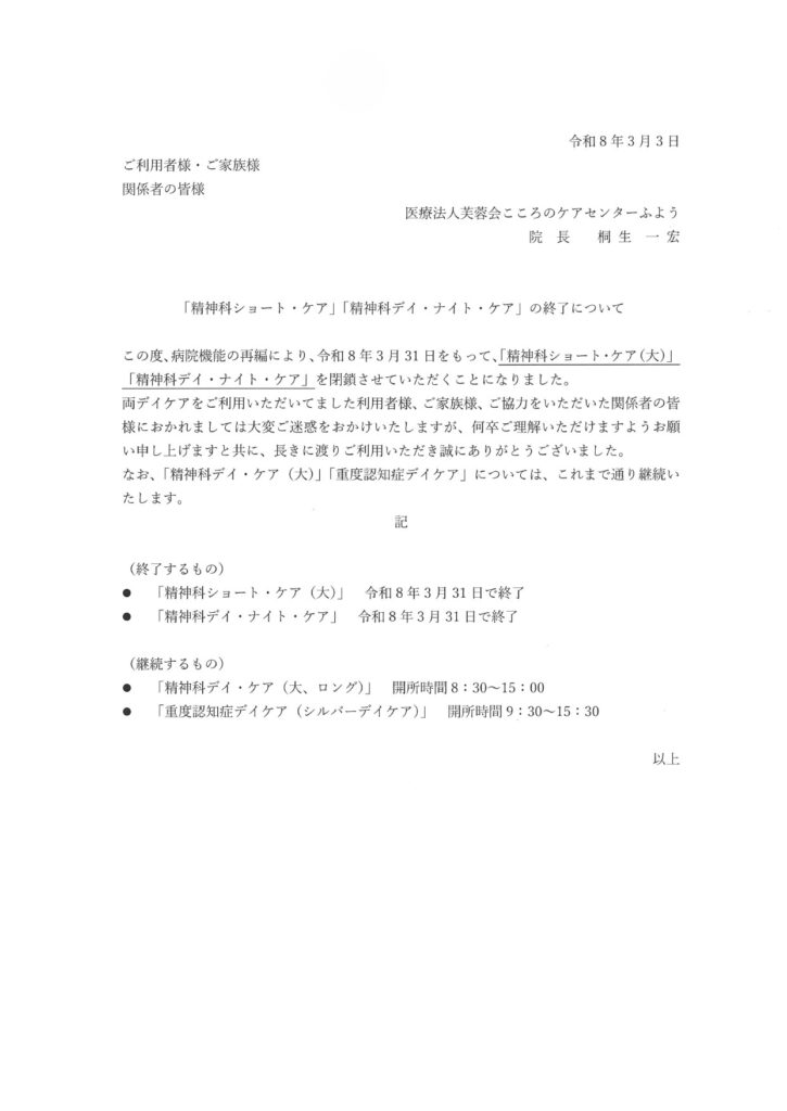 この度、病院機能の再編により、令和8年3月31日をもって、「精神科ショート・ケア(大)」「精神科デイ・ナイト・ケア」を閉鎖させていただくことになりました。